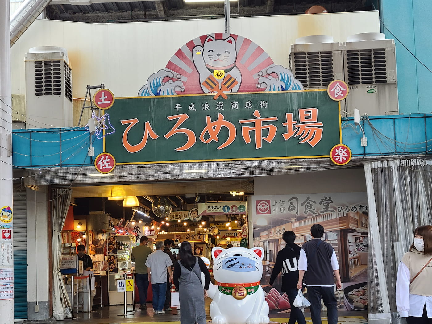本当はひろめ市場で食事して買い物しようと思ってたんだけど、席が全部埋まってる。コロナ対策で6人がけのテーブルに4人しか座れなかったりするのも一因だろうけど、ランチタイムが過ぎ去った2時過ぎで満席とか。